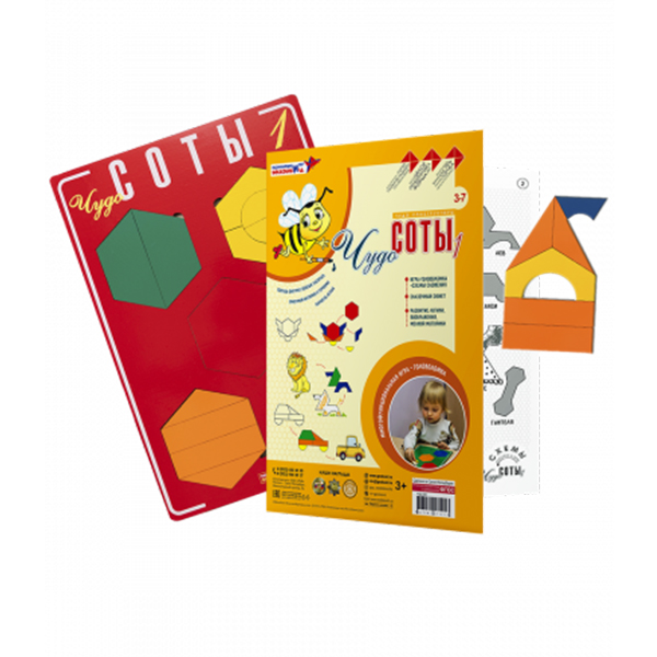 - 5 фигур-вкладышей в форме сот (фанера, пленка красного, желтого, синего, зеленого, оранжевого цветов): 1 целая и 4 составные (из двух, четырех и пяти частей);