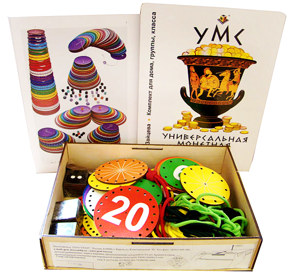 Самые маленькие могут раскладывать "монеты" в ряды от маленьких к большим или собирать их в пирамидки, знакомясь попутно со счетом, цифровой и буквенной записью, цветами спектра.