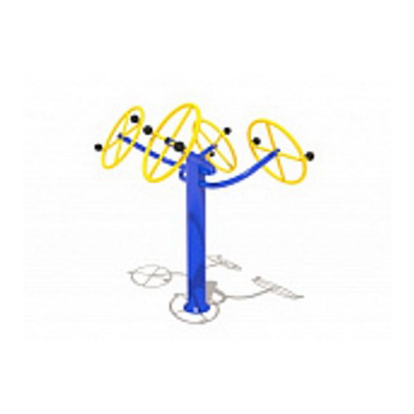 Назначение: Тренажер для выполнения вращательных движений по кругу предназначен для тренировки и укрепления мышц и суставов рук и плечевого пояса, увеличивает эластичность соединительных тканей. Тренажер рассчитан на четырех человек. Несущая стойка тренажера выполнена из металлической трубы сечением Ø 110 мм, бетонируется в землю на 0,6м., сверху стойка закрыта пластиковой заглушкой. Ручка сечением Ø 21 мм Все шарнирные узлы имеют подшипники скольжения закрытого типа. Захваты для рук имеют рукоятки, выполненные из атмосферостойкой резины. Все жесткие соединения выполнены при помощи электросварки. Металлические элементы окрашены порошковыми красками. Крепежные элементы и места срезов труб защищены пластиковыми заглушками.