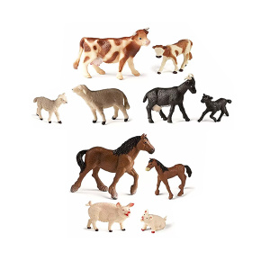 В наборе: лошадь и жеребенок, козел и козленок, свинка и поросенок, овечка и ягненок, корова и теленок.
