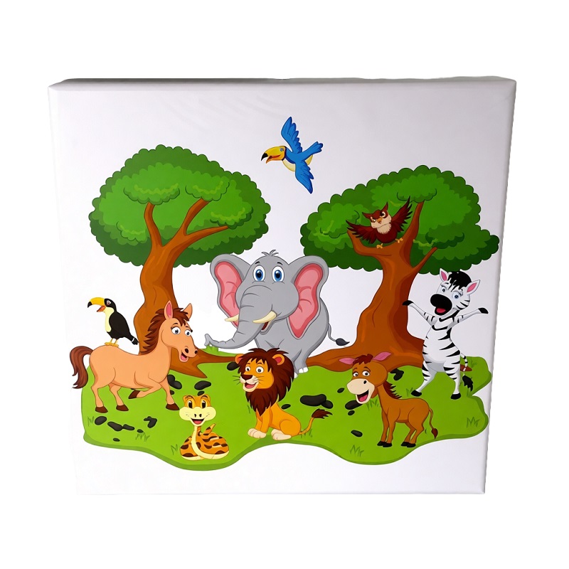 Дидактическая панель представляет собой мягкий настенный модуль с изображением экзотических животных.