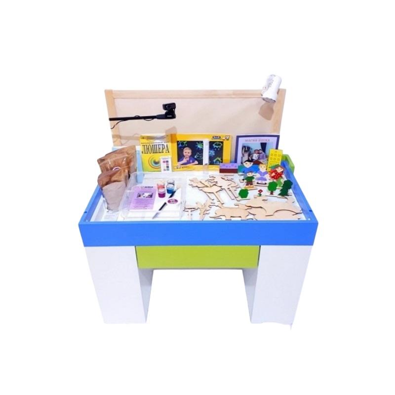 Универсальный модуль для рисования песком, акварелью, театрального, логопедического и психологического развития выполнен в ярких и красочных тонах. Он представляет собой целостную нераздельную конструкцию в виде стола со встроенной светодиодной подсветкой, имеющей функцию переключения цветов и оттенков и технологическими полостями для хранения комплектующих и расходных материалов, входящих в комплект.