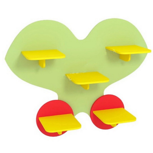 Полка изготовлена в виде вишенок, ярко красного цвета. Панель зеленого цвета напоминает по форме листочки.
