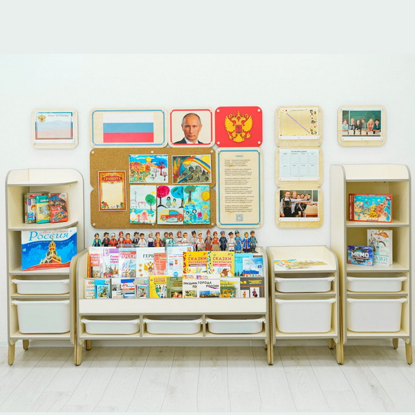 Удобные стеллажи с полками и ящиками содержат всё необходимое наполнение, чтобы проводить занятия с дошкольниками 3-6 лет. Акриловые рамки служат для размещения полезной информации: портрет губернатора, герб и флаг региона, национальный праздник или историческая личность, которую изучают юные воспитанники. На пустой пробковой панели можно легко размещать работы детей или распечатанный наглядный материал к уроку.