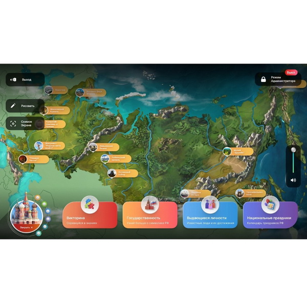 - Интерактивная карта России. В этом блоке дети познакомятся с географическим разнообразием и богатством каждого региона России России. На главном экране представлена карта России, на которой отмечены активные элементы: субъекты РФ, города, культурные и природные достопримечательности, объекты промышленности, природные ископаемые, уникальная флора и фауна. Нажимая на иконки, пользователь может узнать больше информации о каждой из них. В открывшемся окне можно прочитать или прослушать описание объекта, уточнить его местоположение, просмотреть фото. Здесь же на главном экране можно активировать режим «Администратор» и редактировать элементы приложений: добавлять на карту объекты, создавать задания в разделе «Викторина».