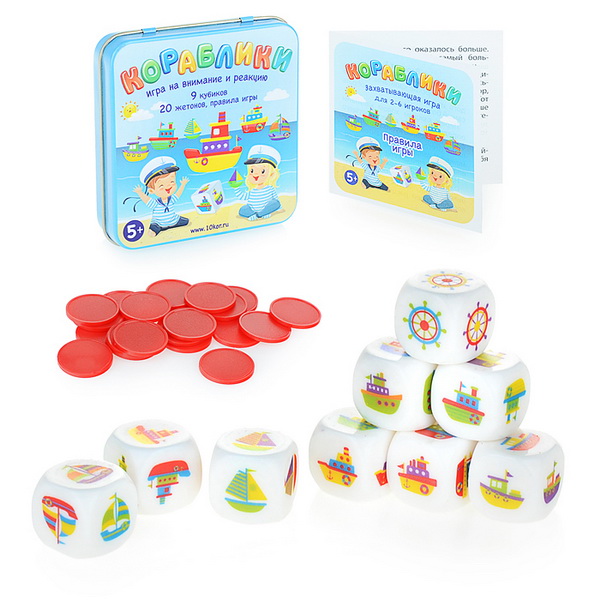 Настольная игра «Кораблики» развивает реакцию, внимание к деталям, концентрацию. Бросай кубики, смотри, в какие цвета раскрашен штурвал, и успей схватить кубики с кораблями в той же цветовой гамме быстрее соперника. Игрок, собравший больше кораблей за ход, получает жетон. Победителем становится капитан, которому удалось собрать больше всех жетонов.