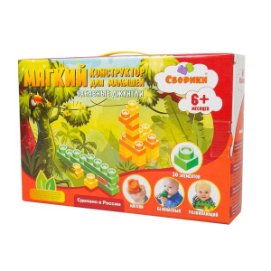 Мягкий конструктор «Забавные джунгли» - это набор из 30 эластичных деталей, напоминающих по форме элементы Лего. Основной их особенностью является материал – безопасный мягкий пластик. Такие детальки отличаются легкостью и прочностью, их можно мять, скручивать и кидать – они мгновенно вернуть изначальную форму. Элементы просто соединять и разъединять, они имеют достаточно крупный размер, поэтому можно не бояться, что малыш их проглотит.
