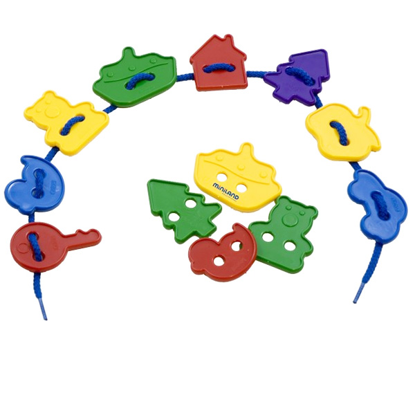 Развивающий набор-шнуровка состоит из 8-ми видов фигур: ключик, уточка, кораблик, машинка, елка, мишка, домик и яблоко, которые представлены в пяти цветах. Также имеется 10 шнурков длиной в один метр.