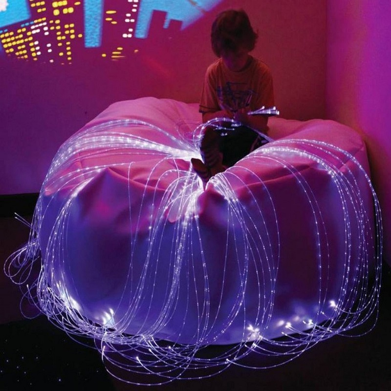 Фибероптический модуль Островок - это мягкое кресло-кровать круглой формы диаметром 120 см. Островок изготовлен из высококачественной экокожи и наполнен внутри теплопроводимыми гранулами пенополистиролла, которые имеют «эффект памяти» и подстраиваются под анатомические особенности тела человека. В чехол встроен пучок фибероптических волокон и источник света, который может менять цвета, оттенки и светоэффекты. Можно извлечь источник света с пучком фиброоптических волокон и использовать их отделльно. Управление светом осуществляется с помощью пульта, который поставляется в комплекте. Каждое волокно в защитной оболочке для безопасности. Фибероптический островок используют для оформления сенсорной комнаты, комнаты релаксации, кабинета психолога или группы детского сада.