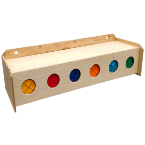 Тактильный модуль представляет собой единый деревянный корпус с 6-ю ячейками. Внутри каждой ячейки мешочек, внутрь которого могут быть помещены различные предметы, которые надо идентифицировать на ощупь рукой.
