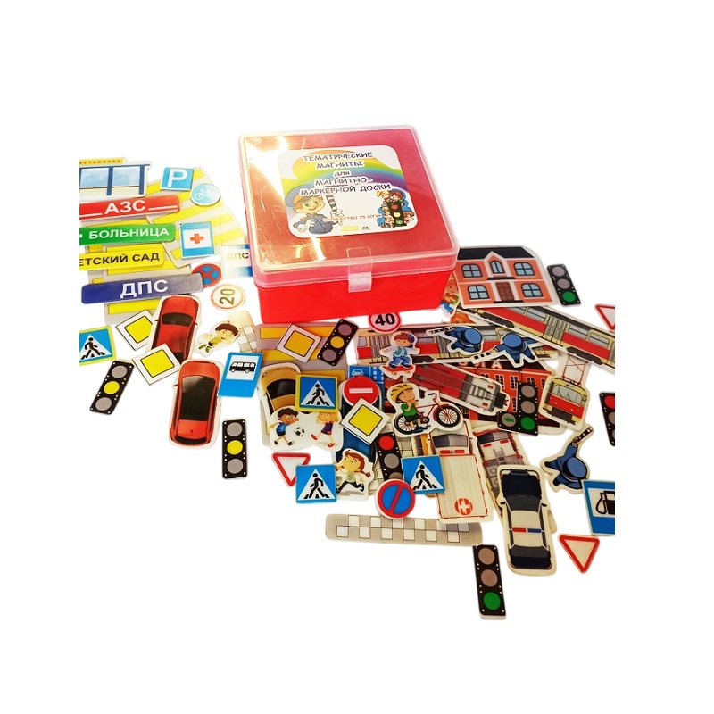 В комплекте 60 тематических магнитов (здания, пешеходы, транспорт, спецтранспорт, дорожные знаки, светофоры, искуственная неровность, зебра). Всё для проведения занятий по изучению ПДД в игровой форме. С магнитами вы сможете легко разобрать все самые известные дорожные ситуации, а также создать свои ситуации требующие внимания.