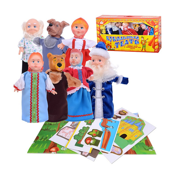 Набор "Кукольный театр" для постановки детских спектаклей по мотивам различных сказок. В набор входят 7 персонажей: дед, мачеха, дочь, падчерица, медведь, Морозко, собака.