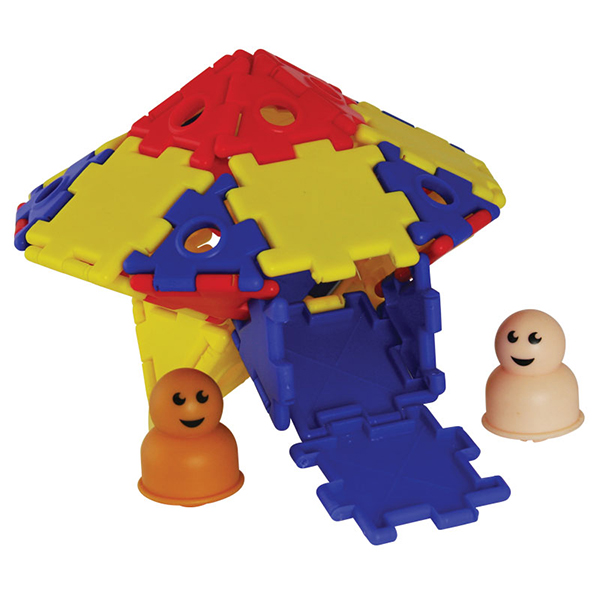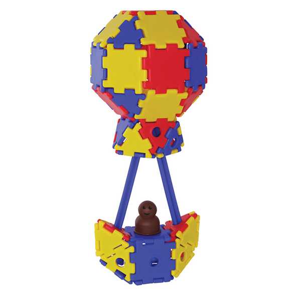 45 треугольников, 45 треугольников с отверстиями, 90 квадратов, 90 квадратов с отверстиями, 36 колец, 12 колёс, 18 осей, 18 детских фигурок и 18 фигурок взрослых.