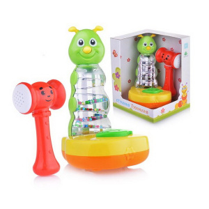 При ударе молотком по листику, раздаётся смешной звук, внутри игрушки прыгают разноцветные шарики.